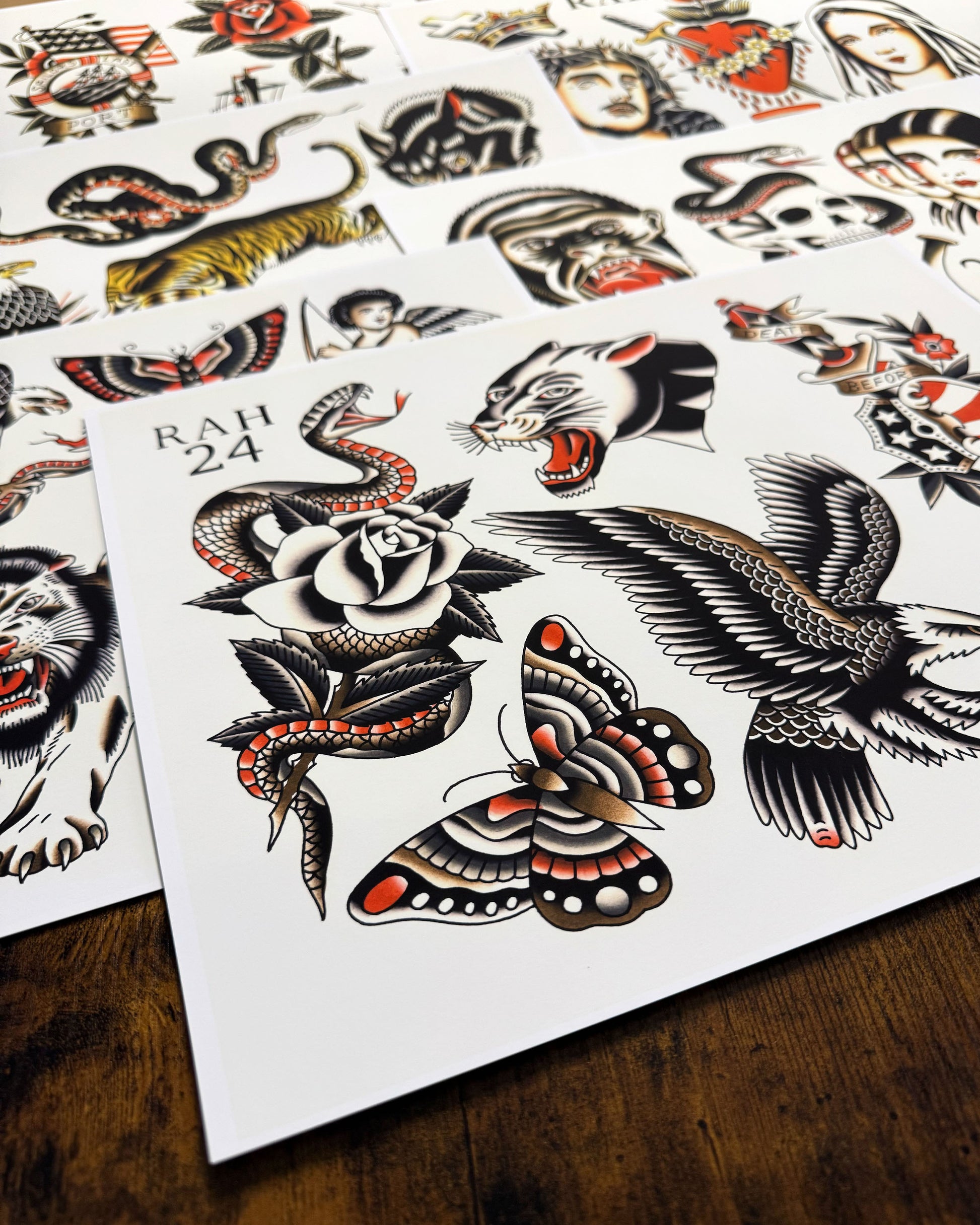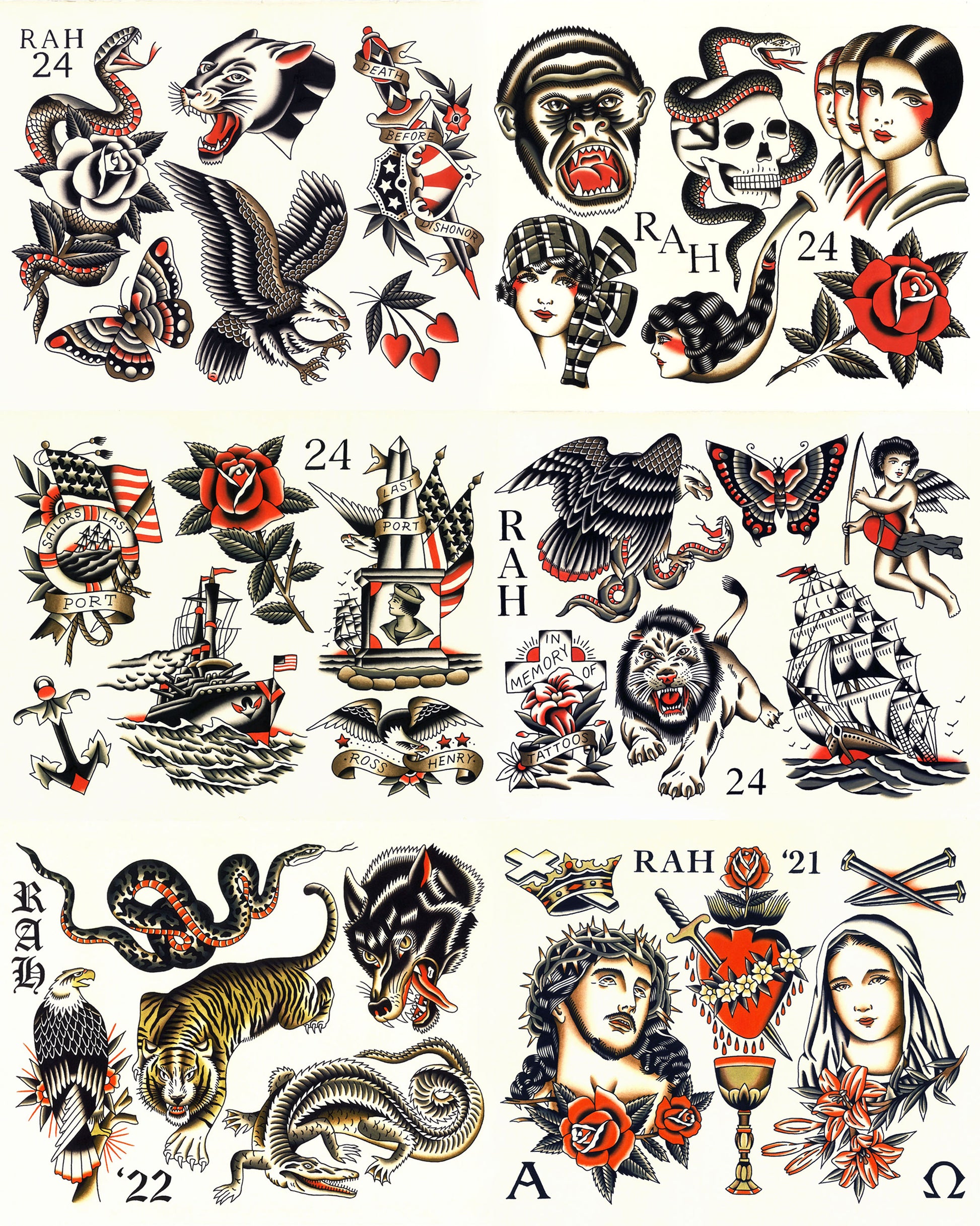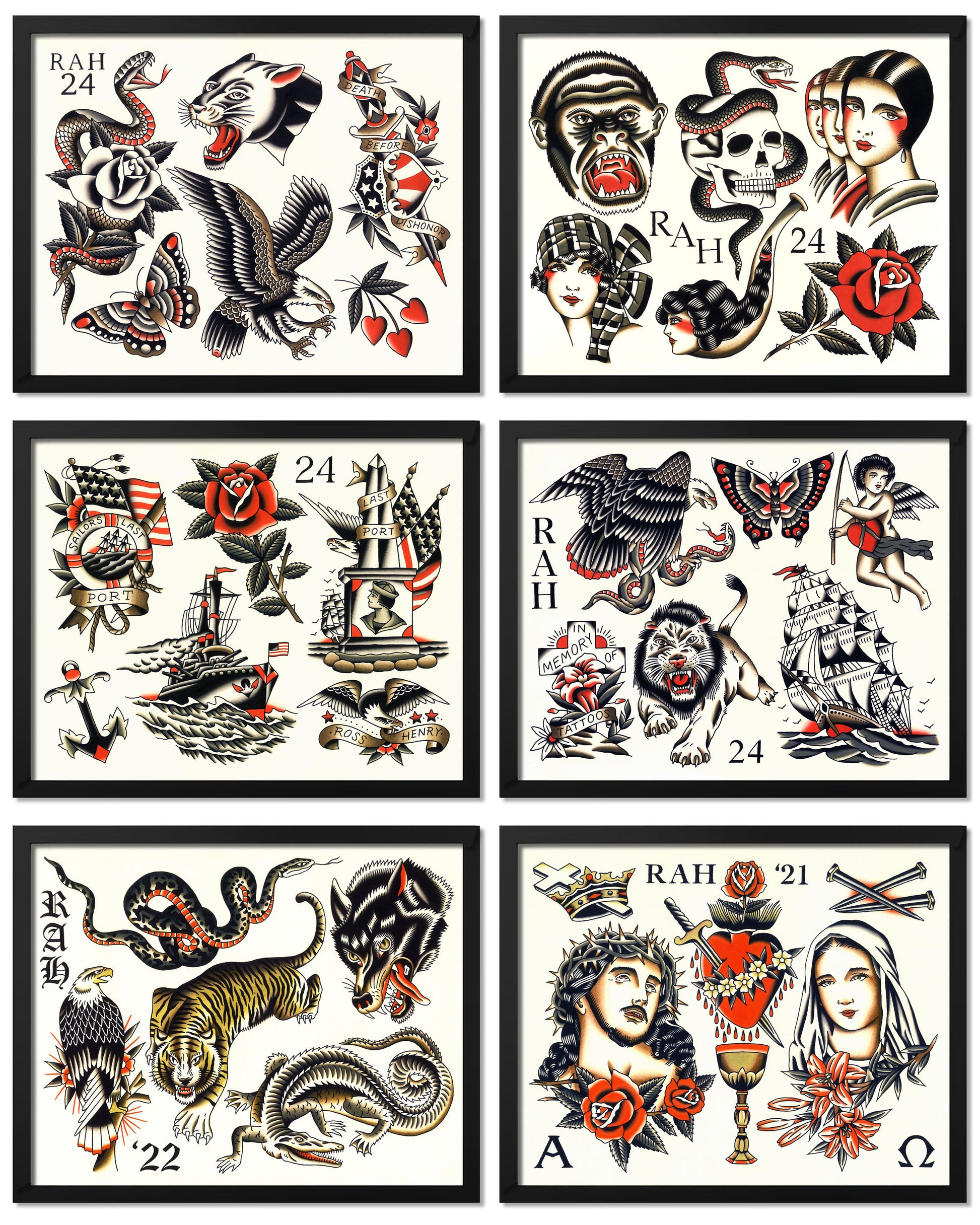 Set of six 11" x 14" traditional tattoo flash sheets by Ross Henry. Printed on high quality, 60 lb. matte finish, fine art inkjet paper.